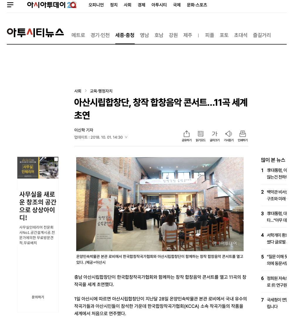 2018-10-01 [아티스트 노트스미스] [아시아투데이] 아산시립합창단, 창작 합창음악 콘서트…11곡 세계 초연