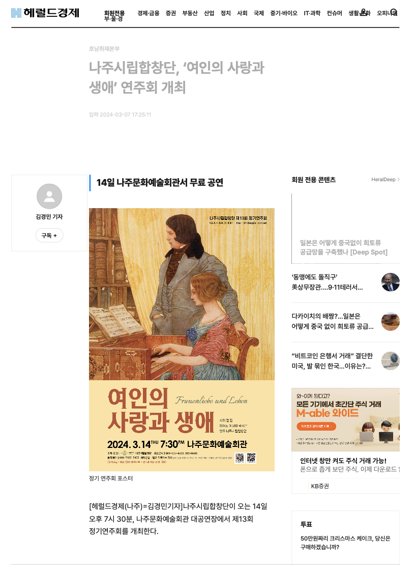 이번 공연은 2부로 구성되며 첫 무대는 로베르트 슈만의 감미로운 연가곡인 ‘여인의 사랑과 생애(Frauenliebe und Leben)’으로 꾸며진다. 화이트데이에...더 자세한 내용은 기사 원문을 확인하세요