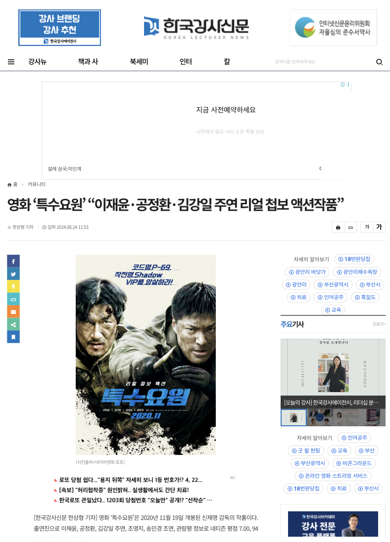 2024-08-24 [작곡가 제이콥 포레스트] [한국강사신문] 영화 ‘특수요원’ “이재윤·공정환·김강일 주연 리얼 첩보 액션작품”