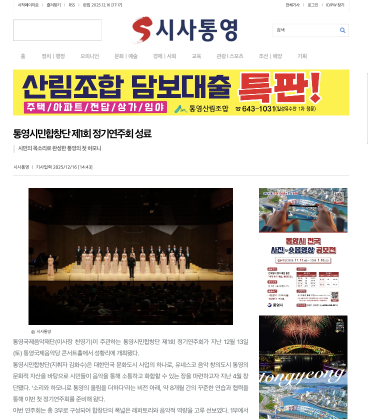통영국제음악재단(이사장 천영기)이 주관하는 통영시민합창단 제1회 정기연주회가 지난 12월 13일(토) 통영국제음악당 콘서트홀에서 성황리에 개최됐다.