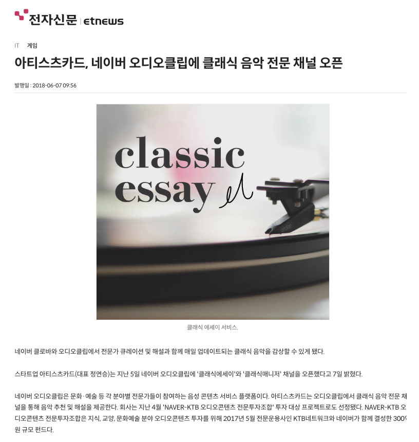 네이버 오디오클립은 문화·예술 등 각 분야별 전문가들이 참여하는 음성 콘텐츠 서비스 플랫폼이다. 아티스츠카드는 오디오클립에서 클래식 음악 전문 채널을 통해 음악 추천 및 해설을 제공한다. 회사는 지난 4월 'NAVER-KTB 오디오콘텐츠 전문투자조합' 투자 대상 프로젝트로도 선정됐다. NAVER-KTB 오디오콘텐츠 전문투자조합은 지식, 교양, 문화예술 분야 오디오콘텐츠 투자를 위해 2017년 5월 전문운용사인 KTB네트워크와 네이버가 함께 결성한 300억원 규모 펀드다.